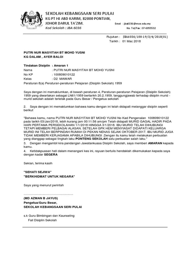 Walau pun nasihat,teguran, surat amaran serta proses kaunseling telah diberi kepada tuan/puan, namun pihak pentadbiran pejabat ini mendapati kesalahan .